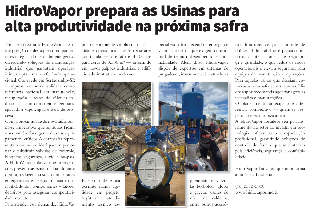 HidroVapor prepara as usinas para alta produtividade na próxima safraPor Manutenção 01 / 28 de outubro de 2025 Fonte: https://jornalcana.com.br/conteudo-de-marca/hidrovapor-prepara-as-usinas-para-alta-produtividade-na-proxima-safra